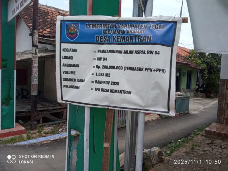 Ketidakjelasan informasi pada papan kegiatan pembangunan jalan di Desa Kemantran, Kecamatan Kramat, Kabupaten Tegal, memicu pertanyaan besar di tengah masyarakat. Berdasarkan hasil penelusuran lapangan, papan proyek yang terpampang di wilayah RW 04 hanya mencantumkan kegiatan “Pembangunan Jalan Aspal RW 04” dengan nilai Rp 200.000.000 (termasuk PPN dan PPh), volume 1.038 m², bersumber dari Bantuan Provinsi (Banprov) Tahun 2025, dan dilaksanakan oleh TPK Desa Kemantran.