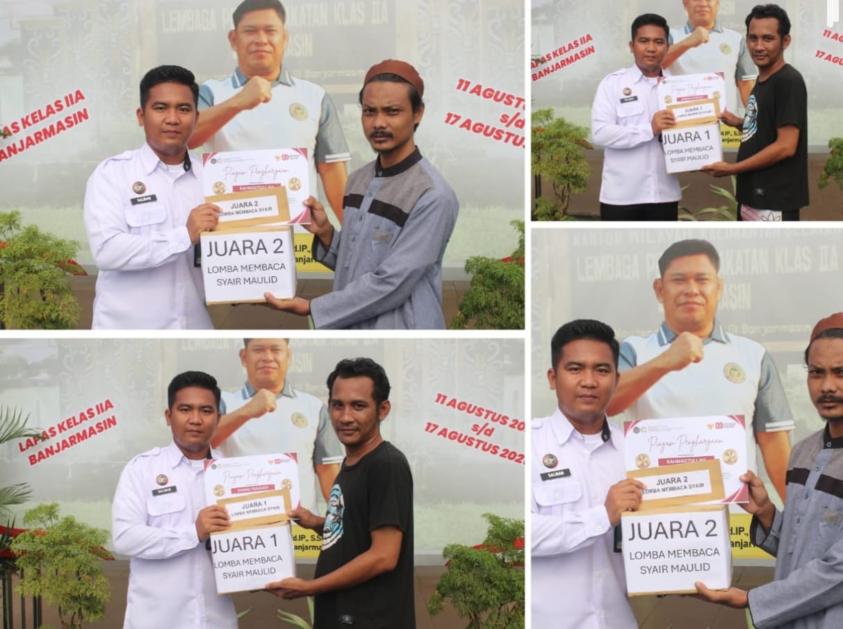 Suasana penuh khidmat dan semarak menyelimuti Lembaga Pemasyarakatan (Lapas) Kelas IIA Banjarmasin pada Selasa (19/08) pagi saat Staf Bimbingan Kemasyarakatan dan Perawatan (Bimkemaswat) sekaligus Pembina Keagamaan, Salman Farsi, menyerahkan piagam penghargaan dan hadiah kepada para pemenang lomba Syair Maulid, bagian dari rangkaian Pekan Lomba Kemerdekaan HUT ke-80 Republik Indonesia.