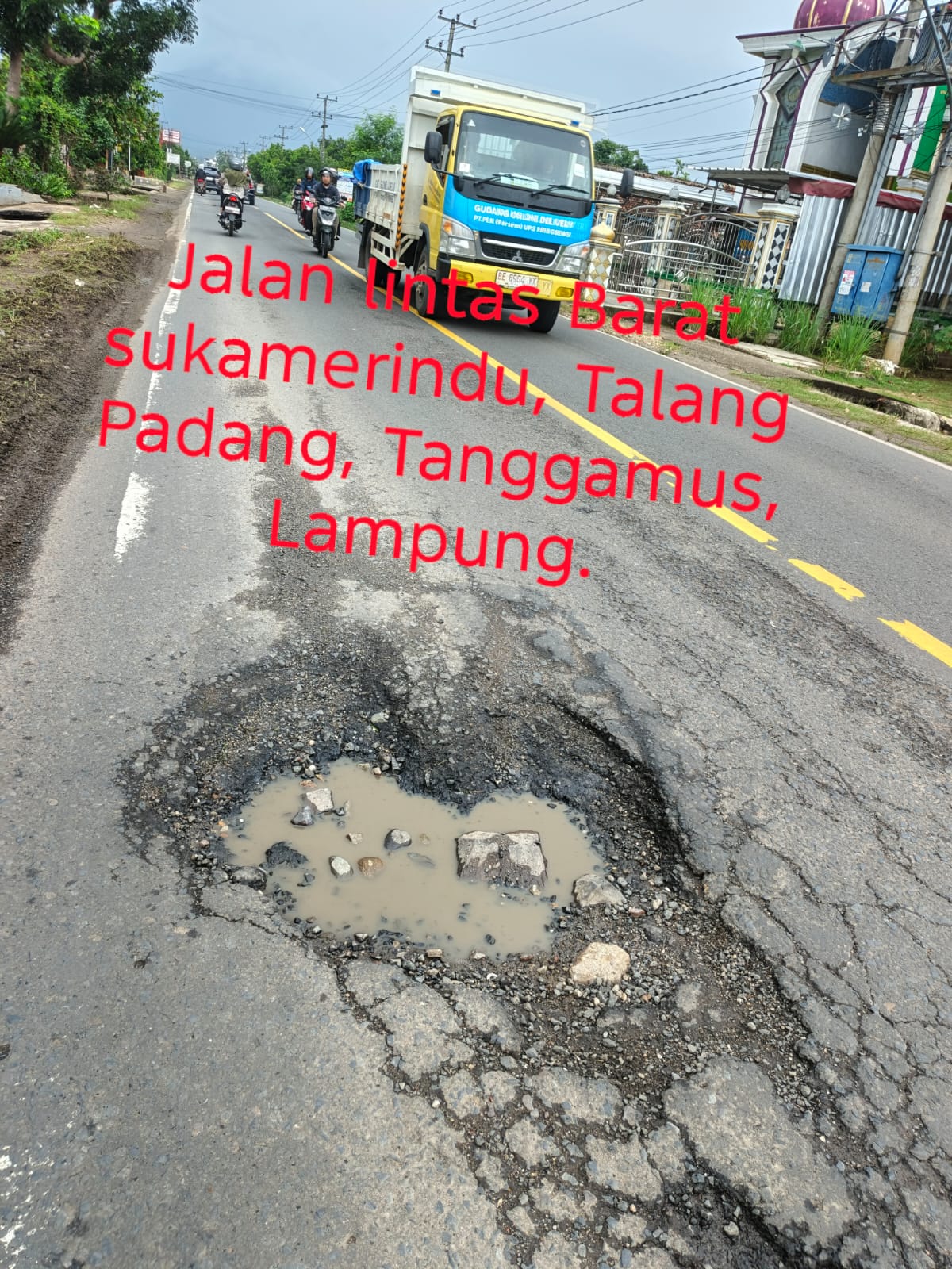 Kondisi jalan berlubang kembali memakan korban. Seorang pengendara sepeda motor yang juga Berprofesi Sebagai Wartawan terjatuh di Jalan Lintas Barat (Jalinbar) Sumatra. Ruas Jalan Sukamerindu, Kecamatan Talang Padang, Kabupaten Tanggamus, bagian dari jaringan Jalan nasional utama di Sumatra yang secara spesifik termasuk dalam rute Jalan lintas Barat (Nomor Rute 7) jalur ini melintas beberapa wilayah, termasuk Talang Padang, Pagelaran, hinga ke Kecamatan Pringsewu. Rabu Malam (17/12/25).