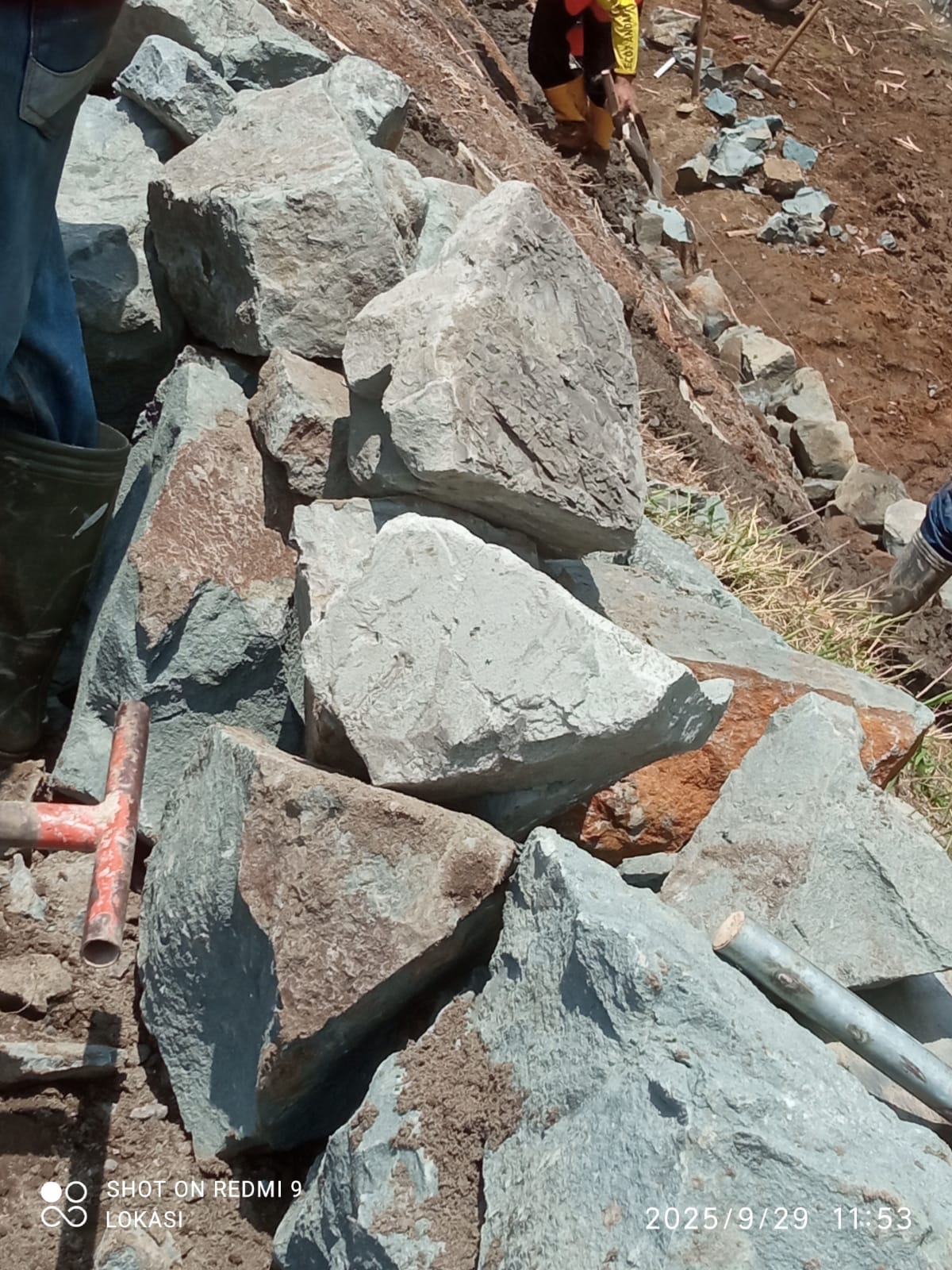 Mepakai batuan blontos dan di pecah sendiri itu pun batu nya bisa di angap abal abal tidak masuk dalam mutu yang benar, dan pasir nya pun. Semacam mengumpal , bukan pasir untuk pasangan batu , semacam lemah