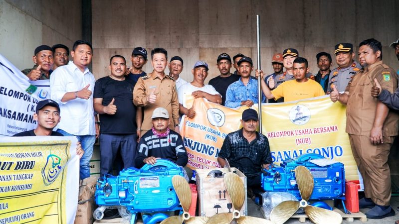 Bupati Rokan Hilir (Rohil) Afrizal Sintong SIp MSi bersama Wakapolres Rohil Kompol Ricky Michael Mandey secara simbolis menyerahkan bantuan mesin boat sebanyak delapan puluh (80) buah kepada kelompok nelayan yang ada di Kecamatan Bangko dan Palika, di kutip selasa (19/9/2023) di pelabuhan ansui Bagansiapiapi.