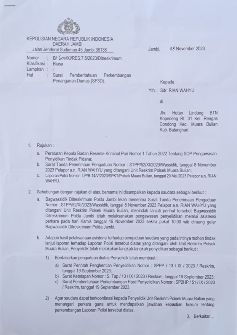 Di lain tempat, Duen Sasberi S.H pengacara Rian Wahyu korban mengatakan melalui pesan WhatsApp bedasarkan SP3D Wasidik Ditreskrimum Polda Jambi tertanggal (28/11/2023) untuk melakukan kordinasi pada Polsek Muaro bulian, adapun hasil komunikasi Duen Sasberi S.H dengan Kanit Polsek Muaro Bulian malah menyarankan membuat laporan baru ke polres Batanghari.