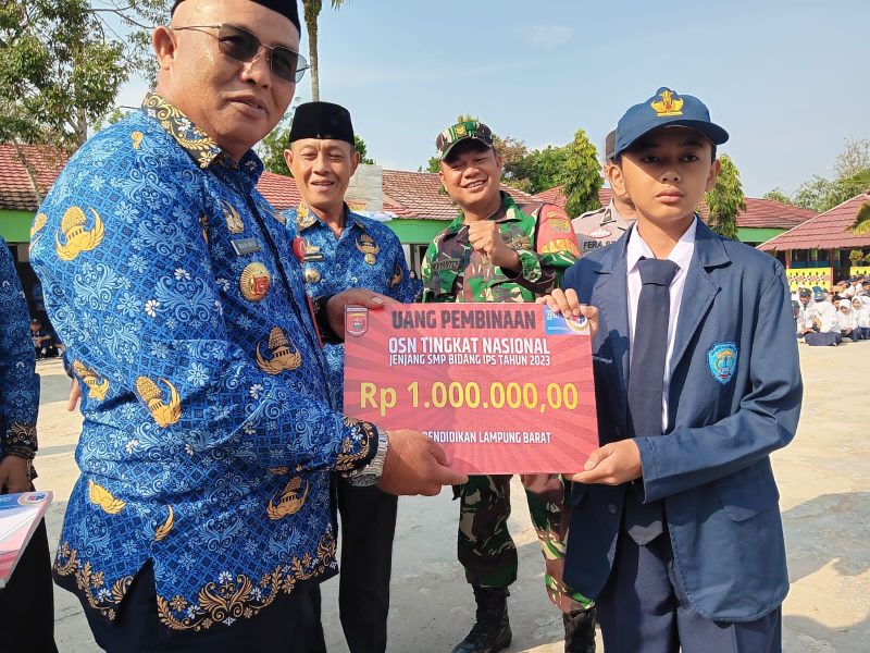 Kepala Dinas Pendidikan dan Kebudayaan (Ka-Disdikbud) Kabupaten Lampung Barat, Bulki, S.Pd., M.M, menyerahkan bonus kepada siswa berprestasi di tingkat nasional, bertempat di lingkungan SMPN 1 Sumber Jaya pada Senin, 18 September 2023.